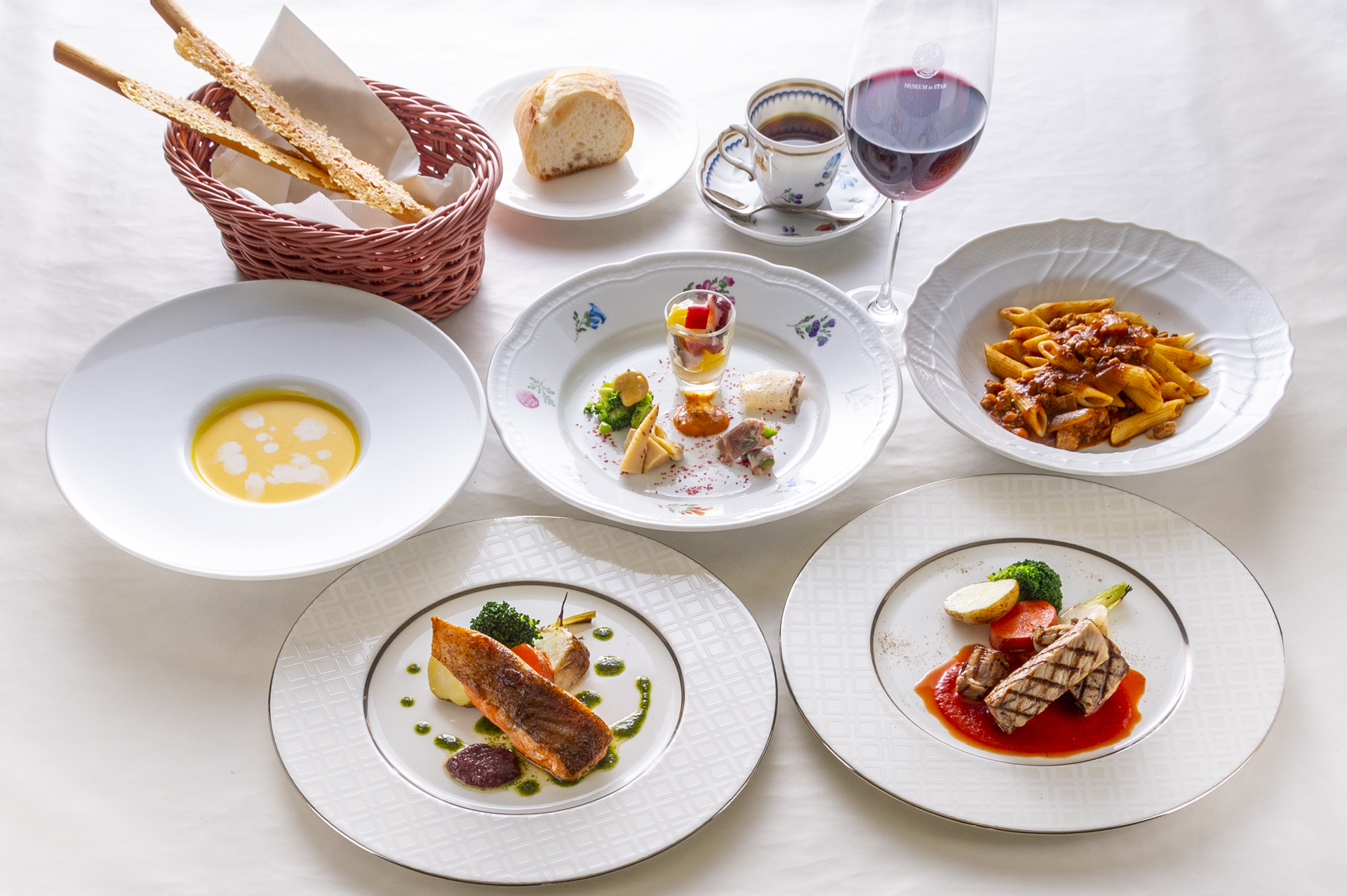 Aコース 前菜盛合せ、パスタ、食後のお飲物 2,900円(税込) デザート付き 3,800円(税込) Bコース 前菜盛合せ、スープ、パスタ、食後のお飲物 3,600円(税込) デザート付き 4,500円(税込) Cコース 前菜盛合せ、スープ、パスタ、メイン料理、 食後のお飲物 5,300円(税込) デザート付き 6,200円(税込)